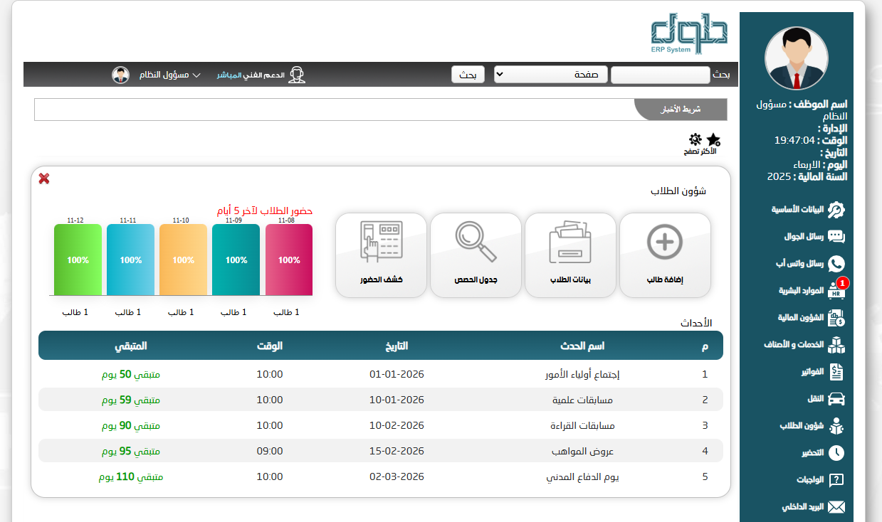 أسمتمع بتجربة فريدة بكل ما يخص شؤون الطلاب او شؤون المعلمين أو الامور المالية في نظام واحد متطلبات التشغيل